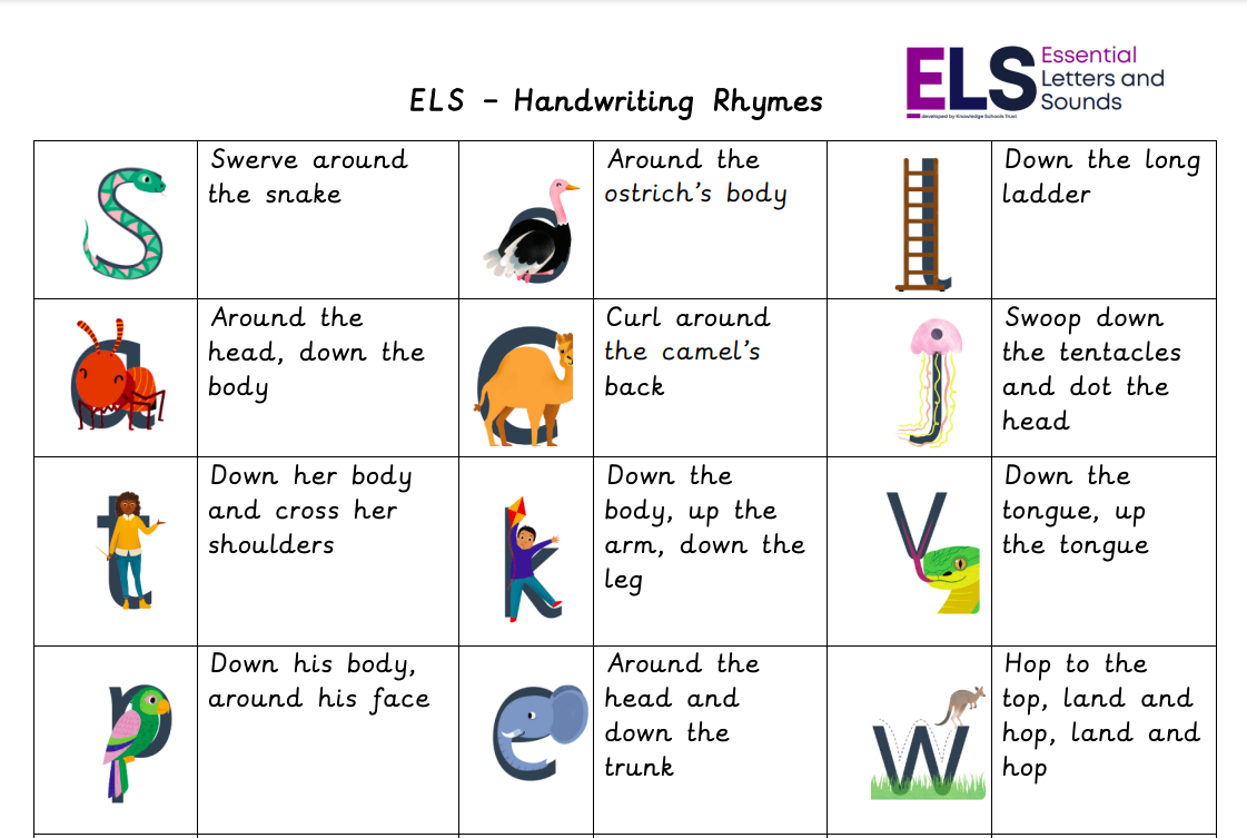 At St Helen's we use the ELS phonics mnemonics to help children to learn how to form their letters correctly.