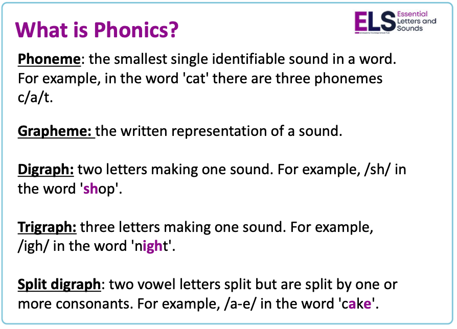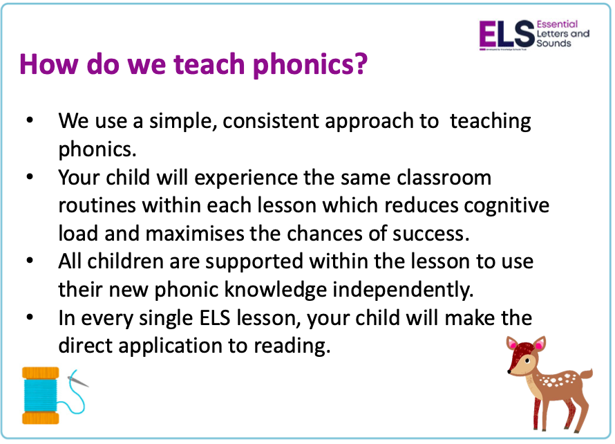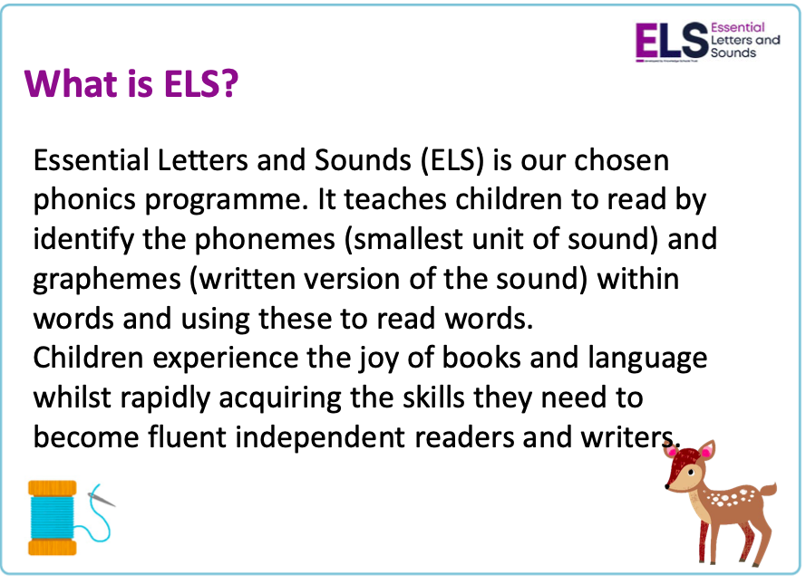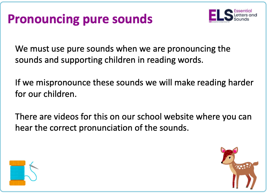 Please find below additional information on how ELS is delivered within our school and videos to help with pronunciation of sounds.