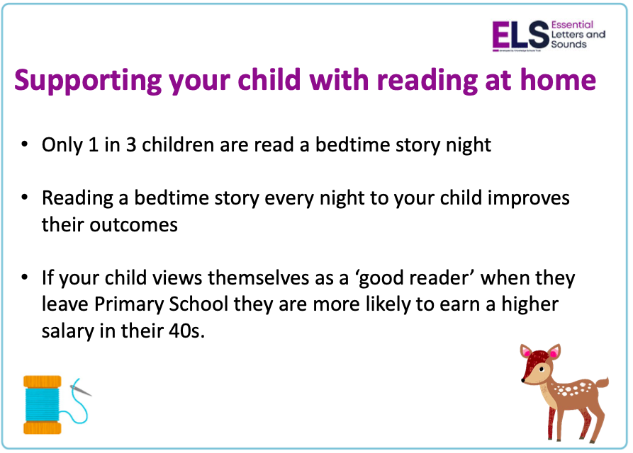 To best support us in teaching your child how to read, we ask that you read with your child 4 times across the week. Spending 10 minutes a day reading with your child will hugely support them in their journey to becoming an independent reader.